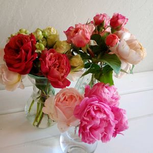 連投失礼いたします🥰 今夜土砂降りとのことなので、少し薔薇の花をカットしました🥹 本当は花首だけカットしたいところですが、花瓶に挿す都合上花茎も長めに切りました😅 都会の花屋さんみたい〜😍💓 今は嵐が来るなんて想像できないくらい穏やかです🥰