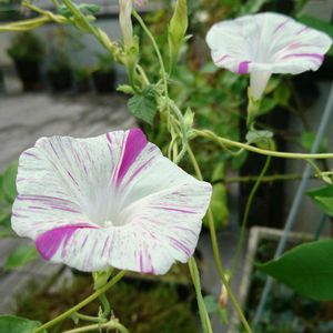 西洋アサガオ ヴェニスピンク 毎年 こぼれ種から育っています 今年は白地にピンクの縞模様の 花が咲く同じ茎(蔓)から 真っ白い花も咲くようになりました 「枝変わり」現象かしら⁉ #2023涼を呼ぶ夏の花草木