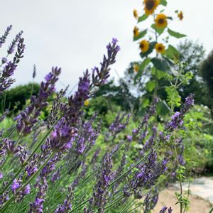 ラベンダーのお花がノビノビと咲いています✨🎶💜 背高のっぽの、ひまわりさんが優しく見守って🌻💛🌻( ◠‿◠ )V 🏷️2023涼を呼ぶ夏の花草木 ラベンダーのお花で、参加させてください✨NO1 ラベンダー シソ科 ラヴァンドラ属 こちら中目黒公園には何種類かのラベンダーが植えられています✨💜 🌿 残念ながらこのラベンダーはあの良い香りが薄かったと思います😆 花言葉 (あなたを待っています)💜
