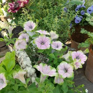 ホワイトピンク地にグリーンの縁どりが爽やかな ペチュニア·バイプレイヤー💗 園芸店に展示されているお花です🌿🌿 流通量が少く入手が難しいそうで、苗は品切れでした😣