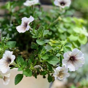 おはようございます^ ^ 玄関前で咲いているペチュニア♡ ①ペチュニア ティー🤍🤎🍃 なかなかモリモリとは咲きませんが、葉のグリーンが爽やかで涼しげです💕 ⓶ペチュニア ムーンライト💚💜🍃 こちらは花数が増えてきました❣️ 寄せ植えのガラニチカさんが暴れてデルフィニウムが何処かへ😅
