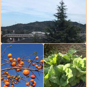 我が家の秋の様子です🍁1️⃣ お山はまだまだ緑💚 柿が沢山なりましたー🧡 10月1日に植えた白菜さん🥬 順調に育ってます⤴️ 楽しみ(^^)/~~~