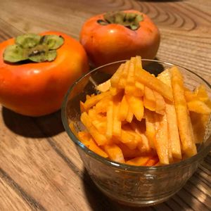 柿ポン。柿の細切りにポン酢をかけて出来上がり。柚子があれば柚子+しょうゆで。白ごはんのお供です。