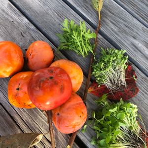 今日の収穫 富有柿、今年は、数え切れない程なり、向こう三軒、両隣、道を通る知らない方、野菜を頂く知人、雀、ひよどり、目白さん達を楽しませてくれた。 そして、今日の朝と昼、甘くなってから、毎日食べられて、有り難いですね。 時差で蒔いた、小蕪、春菊カイワレ