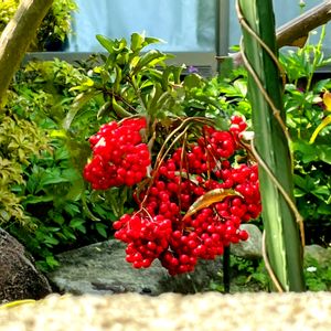 鈴なりの万両の赤い実 通り道のお宅の塀の隙間から写真を🤳 朝のウォーキングで🚶♀️