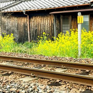 線路沿いに咲く菜の花 JR山口線の踏切から 朝のウォーキングで🚶♀️