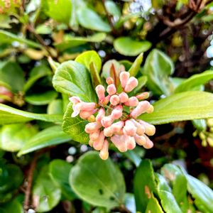 沈丁花の香り 此のお宅の沈丁花は、 仁保川の中川橋を渡り切る手前辺りから、馨しい香りが漂って来ます。 塀から沢山の沈丁花が覗いています。 朝のウォーキングで🚶♀️