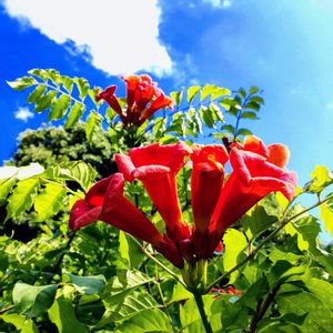 尼崎市上坂部西公園 青空に向かってアメリカノウゼンカズラが咲いていました。