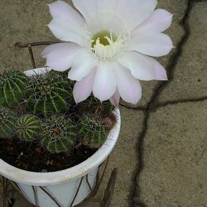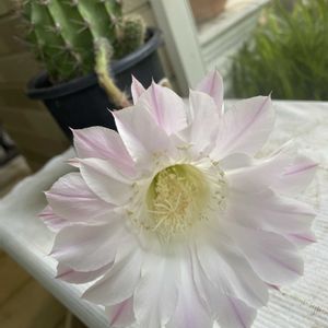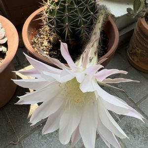 サボテン🌵 エキノプシス 若いうちは球形で、成長するにつれて円筒形になる。 17日に蕾が付いたよと夫がテラスに飾りました。 8/18 朝 咲き出しました。 夕方少し萎み始めました。 1日花なんですね。 花弁の縁が薄いピンク色で可愛いです。 マイガーデン🪴