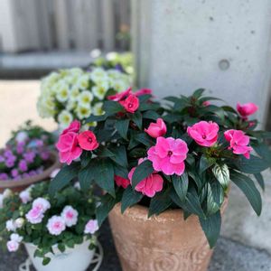 玄関先を彩るニューギニアインパチェンス✨ 見切り品で思わず購入して2週間ほどたちましたが、まだまだ楽しませてくれます。😄