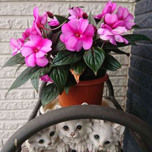 *✿. ニューギニアインパチェンス フクロウさんが見守り開花始めました💖 今日もよか一日に♥(*´꒳`*)ヨキヨキ🌸🍀