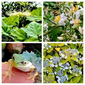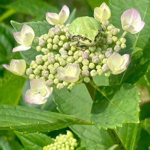 ガクアジサイに住んでるお方が*** 大きなアジサイ館に単独🐸と思ったら… 下の方に同じ大きさの小さな🐸 兄弟なのか別々にたどり着いたのか🐸🐸 どちらにしても仲良くしてねケロケロ