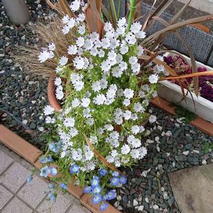こんにちは😊☀️✨ ネモフィラさん3株植えて、こんもりとブーケ💐のようにしたかったのに、真ん中がパックリと空いてしまいました😅 ネモフィラ畑のようにお花が密集して咲いてくれるイメージでしたが、難しいですね😆💦 ネモフィラさんは、地植え向きだと分かりました🤗🌿