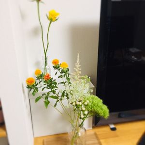 6/18(木) 新顔のお花達に居場所を奪われた先人達。 毎日増えるお花に対し、飾る場所が狭すぎて・・💦 テレビ横まで進出(笑) 小さな花瓶のガーベラは、一晩で花首が垂れてしまい、早々に短くしました。 復活してくれると良いなぁ。