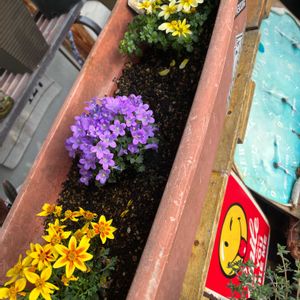 植えて日が浅いのに すこい成長です 茎の先端全てに蕾がつきました スリット鉢のおかげでしょうか このブルーデージー斑入り 安心・ストレス緩和カラー 🏷にそう書かれています 本当⁈ 10株くらい買わねば!
