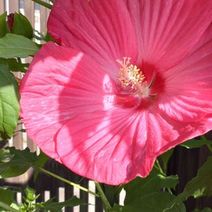タイタンビカス ジュノー ついに咲きました。。大きい。。蕾も笑っちゃうくらい大きい。 測ったら花の直径22㎝あった。背丈は今180㎝ぐらいかな?いい感じで庭の西日よけとなっている。 36㎝の大きな果樹鉢に植えてるのだけど、それでもめちゃくちゃ水を吸うため、1日2回は水をやっている。やりすぎかな、と思うこともあったけど、根腐れもせず無事にここまできた。 こんな大きな花が庭で咲いたら楽しいに違いない、と思って5月に園芸店にて衝動買い。そして今猛烈に楽しい。 水と肥料と日の光をガンガン与えるとグングン成長して巨大な花を咲かす、豪快でわかりやすいとこがいいね。