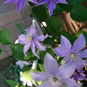 クレマチス ラプソディー、サマリタンジョー共に二番花が咲きました☺️ フロリダは開きかけ。 今日は午後からお天気が下り坂で雨が降り出しました☔️ 毎日少しずつの変化を眺めて楽しんでます😊