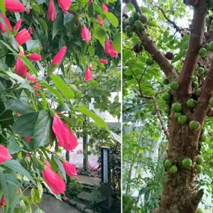 印象的だった温室の植物🌼 左…『ウナズキヒメフヨウ』蕾の時は下向き、開花に向かい花が下向きに垂れる。 右…『ジャボチカバ』茎や枝に直接果実がつく。 相模原公園 サカタのタネグリーンハウス にて。