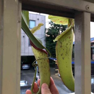 食虫植物を全く知らない(ハエトリソウはホットドッグの大きさと思っている)人に見せたらえんどう豆見たいと言われたネペンテス交配種スパスラータ×ビーチ やたら鮮やかな黄緑色になってた