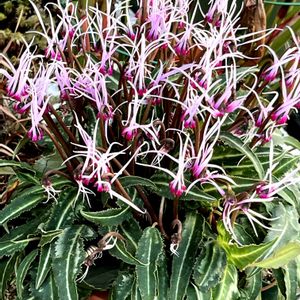孔雀の羽のような尖った花びらと細い葉が特徴の変わり咲きシクラメン🩷❤️🤍 細い花びらがユニーク素敵💓