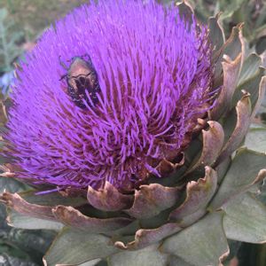 畑のアーティチョークの花が咲いて 誰かお客さんが?💜 調べてみたらハナムグリらしい 触ってみました 動かない ここがいいのかな 逃げようとしない よく見てると花粉を食べているような 頭を花の中に埋めてお食事タイム 小刻みに触手よく動かしています ハナムグリは益虫 蜜蜂🐝と同じように 花巡り 色々な花に花粉運びます🌼🌸 似てる昆虫でコガネムシは害虫です ネキリムシと言って 種からやっと出た新芽かじられて全滅 畑の厄介者です きのう畑の白い苺収穫しょうとしたら 無くなってる💢凄いショック 誰か食べたんだわ それとも鳥🦅? 野菜泥棒よく出没するので人かな? 人の物取るなんて最低👊😡 悔しい事 ハナムグリ見てて ちょっぴり癒されました ハナムグリさんずっとムグムグしてました