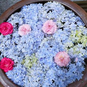 こんにちは〜😊 朝は、涼しくてガーデニング日よりでしたが、暑くて汗が流れます💦💧💧💧 アジサイ万華鏡の花を全てカットしました。 捨てる前に、🏺瓶に浮かべて記念撮影。ブルーだけでは、さみしいので、薔薇をあしらってみました。 来年又沢山咲いてね〜💠💙💠