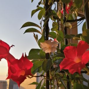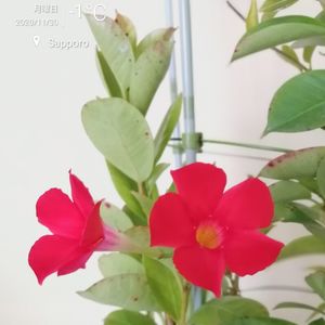 🍀夜明け🍀 🏷真っ赤な火曜日 参加いたします(ᴗ̤ .̮ ᴗ̤ )₎₎ෆ 冬越ししたサンパラソル🌺 蔓が伸びてカーテンレールに絡もうとして大変💦 5/6 4:46 二階東側の窓辺から撮影