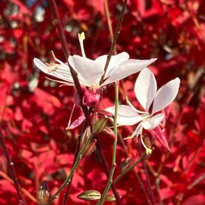 ドウダンツツジをバックに控えてガウラはまだまだ頑張っています。燃えるような赤のツツジと仲良しです♥️♥️♥️ それにしても、春先新緑の葉と共に咲く白い可憐な花の時期のドウダンツツジと、秋の真っ赤なドウダンツツジ、同じ木とは思えぬほど印象が違うと、今更ながら認識しています🥰