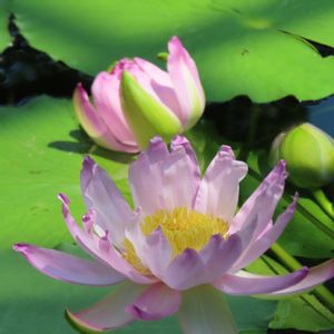 💜イミュタビリスディープブルー🪷💜 オーストラリア原産の睡蓮。 カタログでは淡いブルーって事だけど 咲いて見たら淡いパープルでは? まあ中心の白い花弁とのグラデーションが綺麗。 花size/12〜16㌢、葉size/30㌢