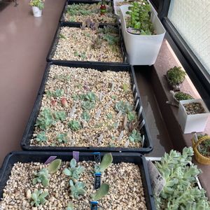 こんにちは😊 昨日は夕方から台風避難していた多肉ちゃん達のベランダお戻し作業をやりました。 日当たりの良い場所をゲットしたデカベリアちゃん達とタニクの妖精🧚♀️達とで、 ハイチーズ❗️😊📷✨