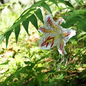 18日に行ったお山、ヤマユリだらけでした。 いろんなヤマユリの中で珍しいお花を選んでみ ました。 1⃣ ベニスジヤマユリ ヤマユリの変異種だそうで、花びらの斑点と同じ朱色の太めのスジがとても鮮やかです。稀にしか見られないことから「幻の百合」と言われているそうです。 2⃣ 1つの茎に、13個の花を咲かせていました。 3⃣4⃣ウバユリが1本だけですが、咲いてました。