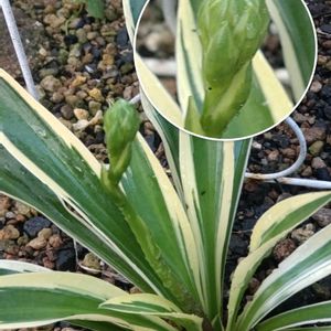 🌿2のつく日は斑入りの日🌿 &蕾からの1輪開花❀✾ ①斑入のギボウシかと思っているのですが? グーグルレンズでは《おもと》てなります!🤔 もらいものだから……花芽が上がってきたから開花したら☝わかりますかね! ②斑入りアオキ 色合いに、切り花と一緒に買ってきて4〜5年! だいぶ大きくなりました! ③オオタニワタリ 貰って来た時は、軽石に🕳穴空けて植えてあったオオタニワタリです! 長い事。枝垂れ梅の木の木陰に置いていたら、尻が土についたみたいで、根づいてしまいました! どうもがいても、引き抜きできない状態です!7〜8年! 放置していたようです! ④デュランタ ホワイト・ラブ 蕾だった房に白い花が咲きはじめました! 宝塚はまだ花芽🌱はでていません! 毎年宝塚が早く開花するのですがね! ⑤秋明菊が1輪開花していました! 雨の日は、植物は元気よくて緑🟩が✨光って👀見えます! 癒やされますね!