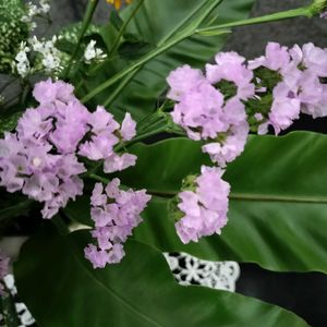 9/3㈬① 🏷水曜日は水色 生け花にあった薄紫色のスターチス (別名リモニウム) 💟💟🌻🌻🌻🌿 ヒマワリとは対照的な控えめなお花。和名は(浜花匙ハマハナサジ)です 薄紫色の部分は萼で中の白い小さなのがお花です♡♡♡ スペインから北アフリカにかけての地中海原産。半耐寒性多年草です。 砂地に生え、海水の塩分や、乾燥に強い性質です