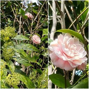 今日の庭 手付かずゾーンの足元が やや片付き 今年は近づいて🤳撮れました 伸び放題のアオキ🍃と 高~いところで咲いてる たぶん椿🌺4輪確認 乙女椿