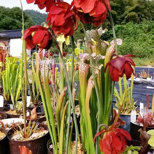左上 leucophyllayellowflower ✕leucophylla white red veins giant 隣Sarracenia rubra ssp. gulfensis giant(HFC由来 産地違いの原種?) 隣Sarracenia 白波 左下Sarracenia leucophylla Schnell's Ghost 隣Sarracenia rubra ssp alabamensis 隣 スカーレットベル 右下のスカーレットベルは元々ホームセンターで500円前後で勝った安い物です!赤色が濃くて綺麗ですね! 左上はシュネルゴーストを1mくらいしたような捕虫葉! 花弁が落ちた物から順に鞘が膨らみ始めてます!