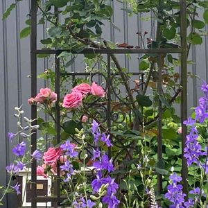*アミ ロマンティカ つる性 四季咲き〜返り咲き メイアン ピェールドゥロンサールを 一回り、小さくしたような薔薇 違いは頂芽優性を無視して 寝かせなくても 茎からも沢山の花を咲かせる 画期的な薔薇 驚きの花付きです。 また、なんと四季咲き 現在6分咲き まだまだ開花が 楽しみな薔薇です🌹 左側の少し大きな花はダフネ サイズの違いがわかります😊