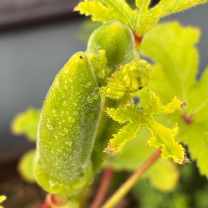 オクラ、エメラルド。最近はゆ〜っくり成長。もどかしくなるくらいです。 実がつくからさ、応援したくなる、期待してしまう。 みなさんどう終える判断されてますか。迷える子羊🐏