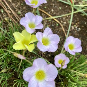 駐車場の入口に咲いていた今日のお花「オキザリス」。 淡いピンク色に黄色い花が仲良く混じっていた。