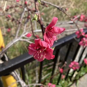 電柱の根元から生えて真っ赤な花をつけた木。 花は桃のようであり、幹は桜のように見える。