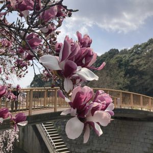 根木内歴史公園沿いを流れる富士川に架かる霜田橋の袂に植えられている「シモクレン」が見事に咲いている。