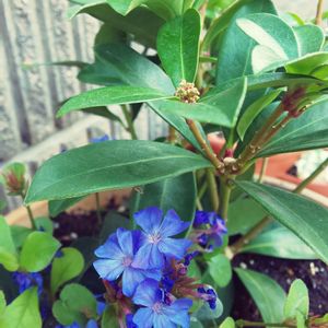 スキミアは夏の間、園芸店の隅に置かれていたもの。お買い得になっていたので、根もカラッからに乾ききっていたけど購入。高価なお花だから大切にしたい😄 ルリマツリモドキはブルーサファイアという名前が付いていて、まさにそんな素敵な色です💙