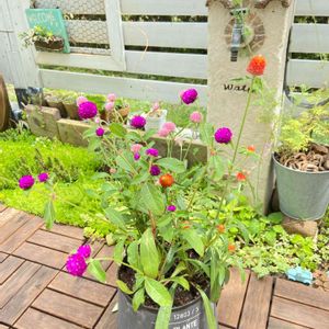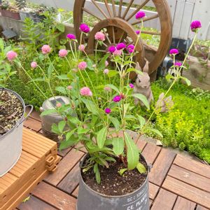 千日紅 何度もすみません。 ストロベリーフィールドは球根を作る多年草だとわかったので、この寄せ植えから抜いて玄関の方に地植えしてみました!