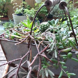 ブリキ鉢の多肉たち たくさん、入れられて、ちまちま鉢からこちらへ! リプサリス、サボテンの仲間なんだ!緑から赤色にもなるし、たくさん増えてくれる