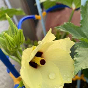おはようございます☀朝の水やり後のオクラさんは生きるパワー全開です。花の下部分が半分オクラの緑がしっかりしてきました。 成長過程が見れるのは家庭菜園の醍醐味です♪
