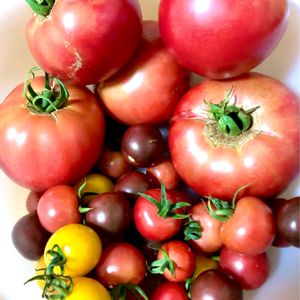 トマトを収穫🍅🍅🍅 畳一畳ちょっとぐらいの小さな家庭菜園でトマトを収穫しました。 いろんな種類のトマトの苗🌱を1本ずつ買って来て育ててみました。 ちゃんと手入れをしていないので、枝がごちゃごちゃに伸びて、どのトマトが何という名前の苗か分からなくなってしまいましたが、ある程度沢山採れたのでまあヨシ⁉️というところです。 形や大きさは、店で売ってる物と比べたらどれも見劣りしますが、自分で育てた(ほったらかしでも育ってくれた😅)野菜や果物が一番おいしく感じます。😄
