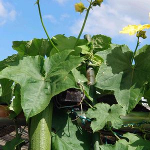 菜園だより〜👩🌾 昨日の📺で話題になった バターナッツかぼちゃ🎃 TV放送後 ネット通販を見ると高値段にびっくり😲❕ 去年の実種から🌱芽吹き 暑さ🥵で手入れせず 菜園の縁沿いを伸び放題 虫達のお陰で自然受粉していたみたい😁 さて今年は…いくつ実るかな……
