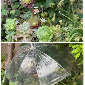 風が強かったですよね☂️💦いつも梅雨時から傘を差し始めます💕濡れて蒸れるのは勘弁して欲しい…😆ところが、この風で傘がどこかに飛んで行ってしまいました😱 流木切り株の多肉さん達、大騒ぎ😜 (普段は埋め込んだビニールパイプに白い蛇口を差し、雨なら傘登場)