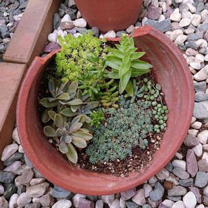 台風の風で倒れて割れてしまったテラコッタ鉢。 捨てるのは しのびないので、横に寝かせて寄せ植えしてみた🌱