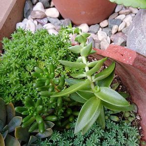 台風でグチャグチャになっちゃった多肉たちを集めた寄せ植えのその後。 無事に根付いたみたい👍 七福神が大きくなってる😊 しかも根もとには、子株ちゃんが出はじめたよ❤️ (写真では わからないけど😅) デザートローズも、銀波錦も、セダムたちも 元気もりもり💪 一時は どうなるかと思ったけど、ひと安心かな🤗