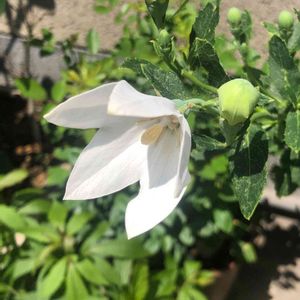 桔梗 うす紫のものが一般的です。うちのは白😊 山上憶良が万葉集で『秋の野に 咲きたる花を 指折り(およびをり)かき数ふれば 七種(ななくさ)の花』と詠んでいる7番目の「朝貌(あさがお)」が桔梗。